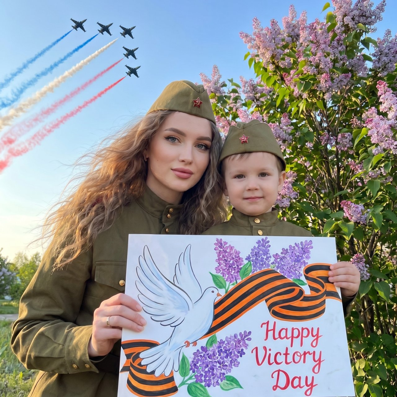 NanoBanana ProСоздай Портрет не меняя черты лица. Молодая женщина с длинными волнистыми волосами , некоторые пряди развивает ветер,и с безупречным макияжем, одетая в оливково-зеленую военную форму и фуражку с красной звездой, рядом с ней ребенок, одетый в соответствующую оливково-зеленую военную форму и фуражку с красной звездой. Женщина и ребенок держат огромный ватман -плакат с рисунком со стилизованным белым голубем, оранжево-черной полосатой лентой (Георгиевской лентой), фиолетовыми сиреневыми цветами и красной надписью «С Днём Победы». Ребенок смотрит вперед с легкой улыбкой, а женщина с нежным выражением лица смотрит в камеру. Они стоят на фоне дерева сирени, видно небо . На заднем плане, на фоне ясного ярко-голубого неба, пять реактивных самолетов военного типа летят строем, оставляя по небу следы красного, белого и синего дыма диагональными полосами, напоминающими цвета российского флага. Самолеты темные, вырисовываются на фоне яркого неба. Композиция: снимок верхней части тела женщины и ребенка, самолеты и следы дыма занимают верхний левый и центральный фон. Рисунок располагается на переднем плане, слегка наклоненный. Общая перспектива находится на уровне глаз предметов. лицо слегка освещает рассветный свет .