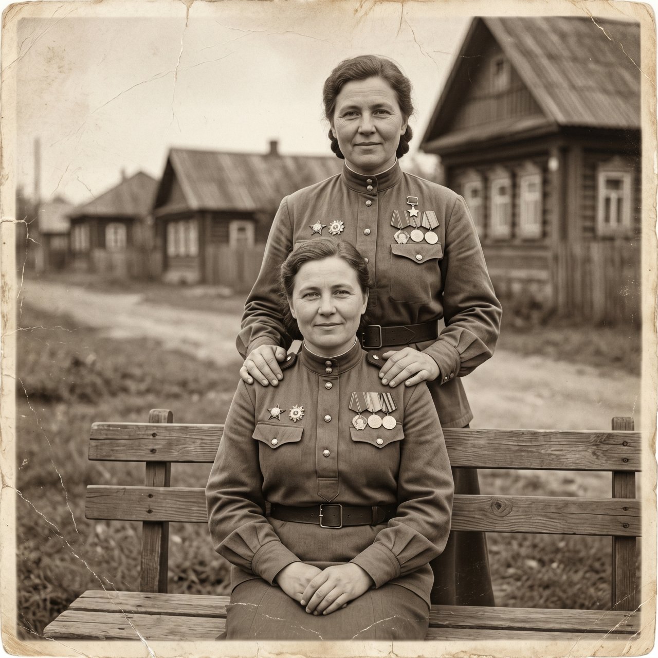 NanoBanana ProИспользуй лица загруженных фотографий как референсные, фотореалистичный двойной портрет двух женщин в советской военной форме времён Великой Отечественной войны, одна женщина сидит на деревянной скамье, другая стоит позади, мягко положив руки ей на плечи, спокойные и тёплые выражения лиц, естественные эмоции, военная гимнастёрка с пуговицами, ремнями и наградами на груди, винтажная стилистика старой фотографии, чёрно-белая или сепия, лёгкая плёночная зернистость, царапины и потертости старой фотобумаги, фон — тихая деревенская улица с домами, размытый пейзаж послевоенного времени, атмосфера памяти и семейной истории, мягкое рассеянное освещение, реалистичные детали ткани и лиц, лёгкое размытие фона, вертикальная композиция, портрет по пояс, историческая эстетика, эффект архивной фотографии середины XX века, высокая детализация, качество 8K, состаренные края кадра, лёгкая виньетка, атмосферный документальный стиль.