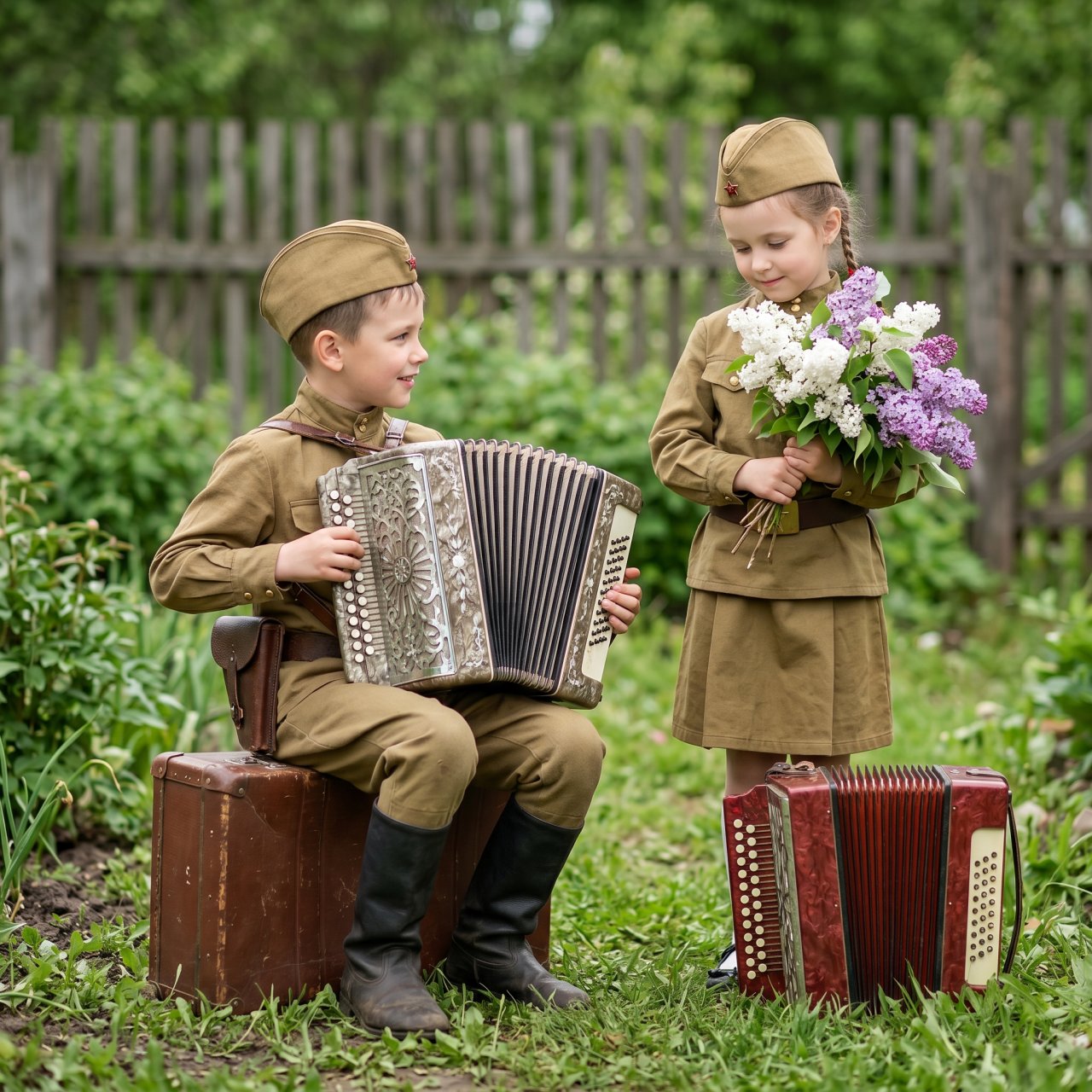 NanoBanana ProЗамени лица с прикрепленных фото. Это фотореалистичный, высокодетализированный снимок двух детей в аутентичной советской военной форме РККА 1940-х годов в пышном зеленом саду на фоне старого деревянного забора. Мальчик (с новыми чертами лица, заменяющими оригинальные) в пилотке с красной звездой, гимнастерке и галифе сидит на потертом винтажном кожаном чемодане и играет на большом старинном перламутровом аккордеоне, глядя на девочку. Стоящая рядом девочка (с новыми чертами лица, заменяющими оригинальные) в пилотке с красной звездой и платье-гимнастерке с ремнем держит в руках пышный букет свежей белой сирени, глядя вниз на цветы. На земле справа стоит второй, красный аккордеон. Освещение мягкое и естественное, подчеркивающее текстуру ткани и реквизита; композиция средний план с мягким боке фона.