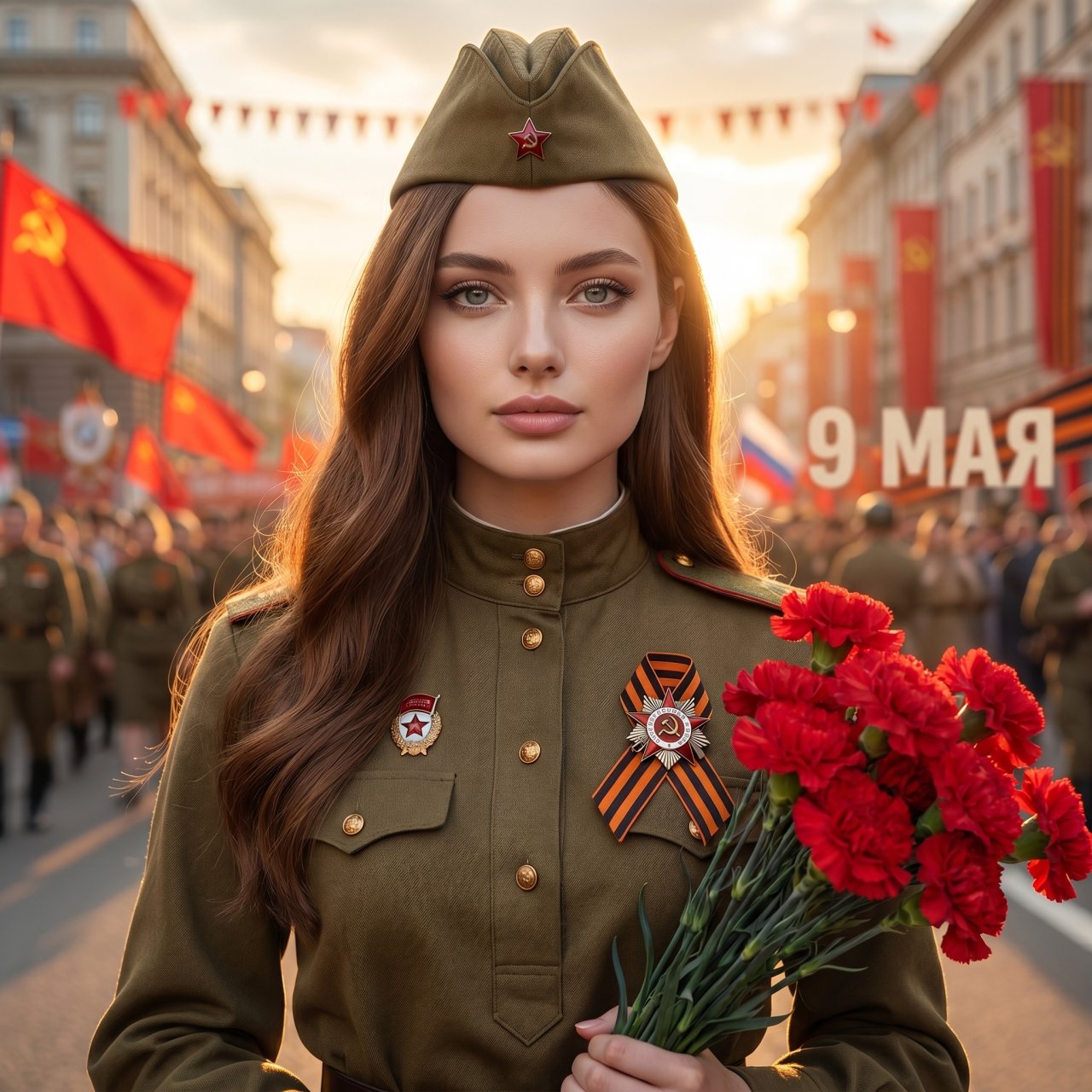 NanoBanana ProИспользуй лица загруженных фотографий как референсные, реалистичный портрет молодой женщины в советской военной форме времён Второй мировой войны, стройная фигура, длинные густые каштановые волосы, гладко уложенные и спадающие на плечи, выразительные светлые глаза, аккуратный макияж с подчёркнутыми ресницами и естественными губами, оливково-зелёная гимнастёрка с пуговицами и нагрудными знаками, пилотка с красной звездой, на груди георгиевская лента и памятный орден, в руках большой букет ярко-красных гвоздик, фон — праздничная городская улица с советскими флагами и растяжками ко Дню Победы, видна надпись «9 Мая», тёплое закатное освещение, мягкие золотистые блики на коже и ткани, кинематографичная атмосфера, высокая детализация, фотореализм, глубина резкости, лёгкое боке, чёткий фокус на лице и букете, праздничное настроение, патриотическая эстетика, насыщенные цвета, вертикальная композиция, портрет по пояс, ультрадетализированная текстура кожи и ткани, реалистичные тени, профессиональная портретная фотография, качество 8K.