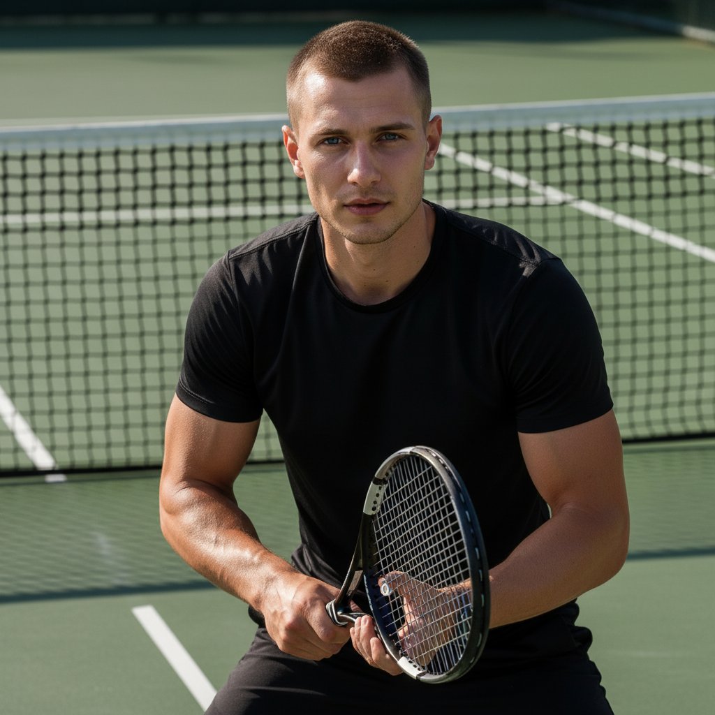 Спортсмен в черной форме, с напряженными мускулами, держит теннисную ракетку. Его взгляд направлен в объектив, выражая решимость. Легкий блеск пота на коже. На заднем плане — теннисная сетка, солнечный свет отбрасывает длинные тени. Снято крупным планом, подчеркивая атлетизм и боевой дух.
