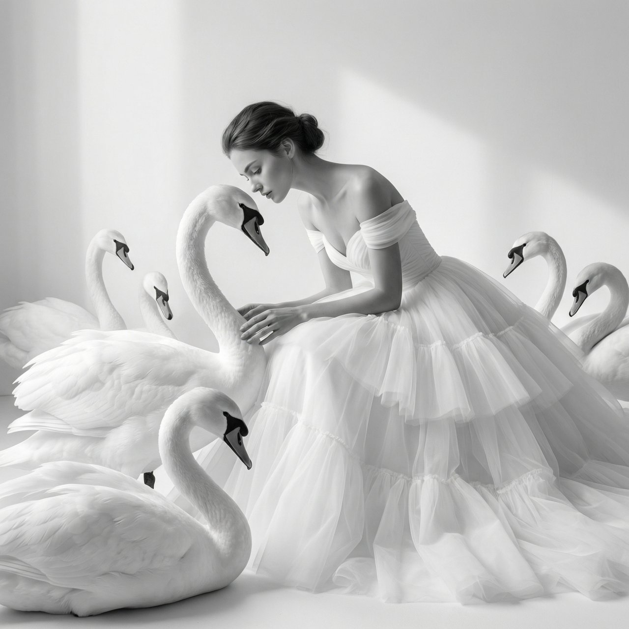 NanoBanana ProСоздай портрет, не меняя черты лица. Фэшн-фотография модели среди величественных белых лебедей с мягкими плавными линиями и детализированными перьями. Она элегантно наклоняется к лебедю. На женщине изысканный белоснежный наряд: платье с открытыми плечами и воздушной многослойной юбкой. Чистая монохромная светлая палитра, минималистичный белый фон с мягкими тенями. Гиперреалистичный редакторский стиль, 8k, детализированные текстуры. 9:16