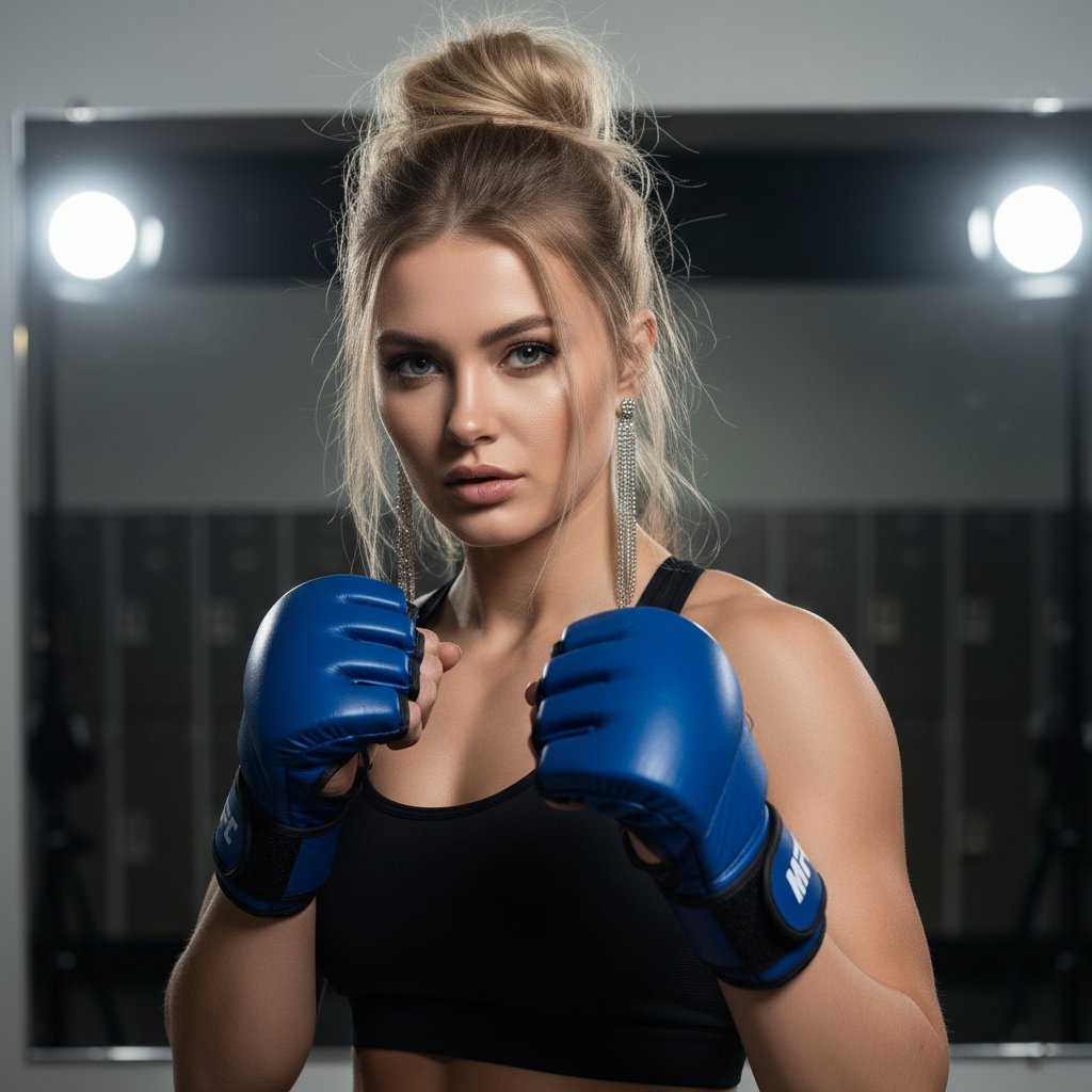 Женщина-боец ММА, высокая прическа, длинные серьги, синие перчатки. Позирует перед зеркалом, смотрит в камеру. Уверенная поза. Яркий свет выделяет мускулатуру. Крупный план.