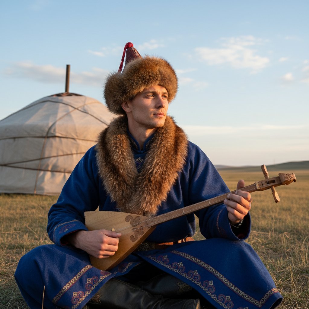 Мужчина в традиционном бурятском одеянии с меховым воротником расположился на земле рядом с юртой. В руках он держит музыкальный инструмент, а его взгляд устремлен вдаль с задумчивым выражением лица. Фотография выполнена крупным планом, подчеркивая глубокую духовную связь с культурой.