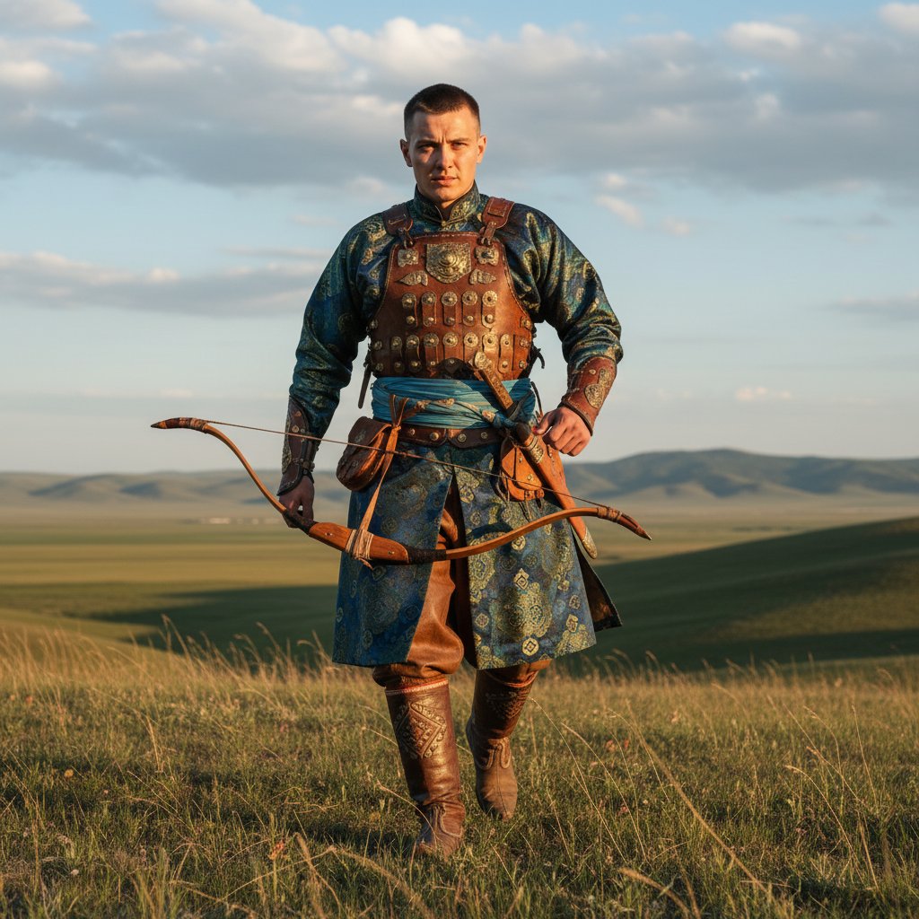 Портрет мужчины в традиционном бурятском воинском облачении, с коротким луком у пояса. Он идет по холму и оборачивается к зрителю, его лицо выражает сосредоточенность. Снимок крупным планом, подчеркивающий движение и воинскую стать.