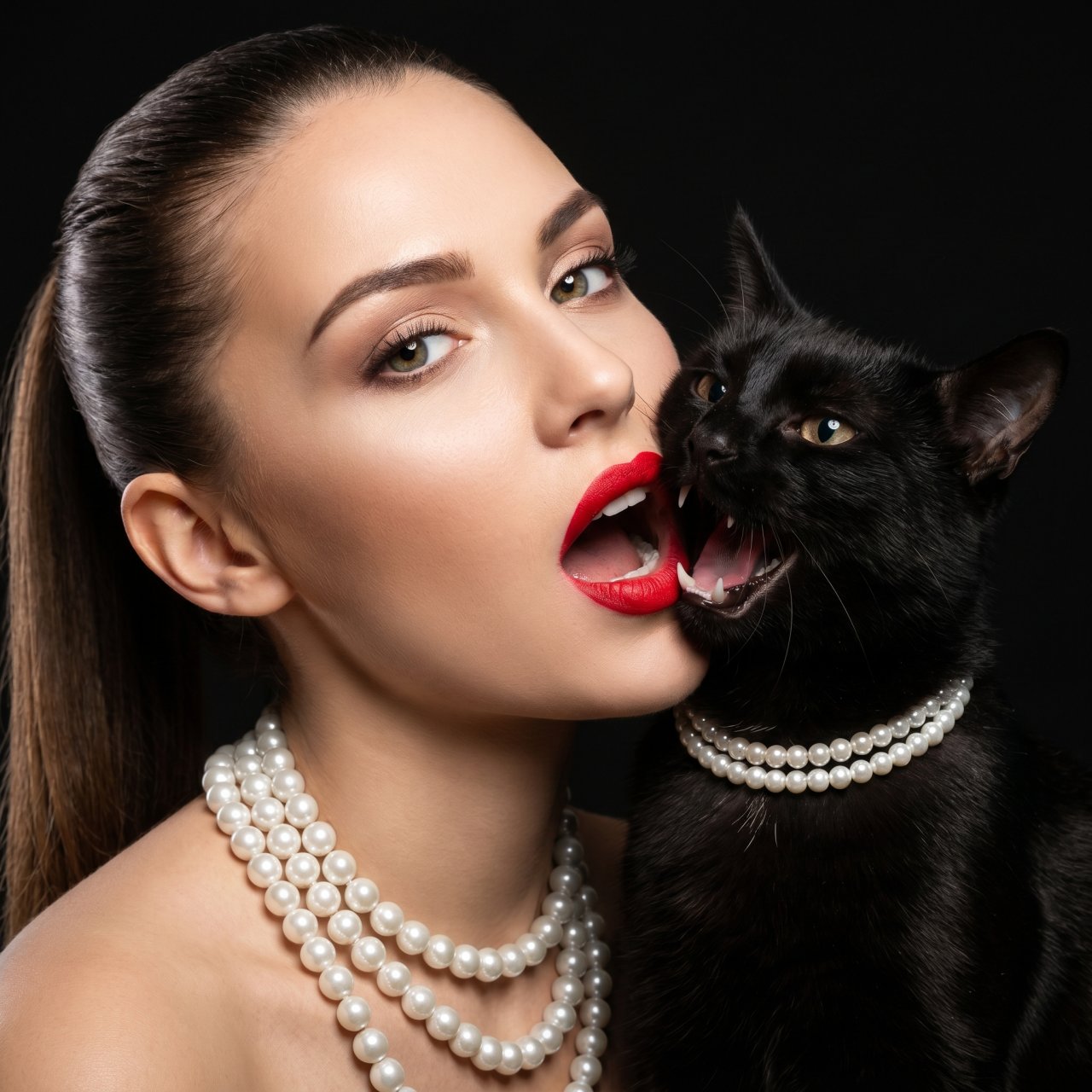 NanoBanana ProСоздай крупный макро портрет, не меняя черты лица. Крупный, плотный план, сюрреалистическая и провокационная модная фотография, запечатлевающая интимное взаимодействие между человеком и черной кошкой. Слева — крупный план лица женщины с безупречным макияжем , сияющей кожей. Ее губы накрашены ярко-алой помадой, рот широко открыт, обнажая безупречные белые зубы. На ее шее многослойное ожерелье из крупных белых жемчужин (четыре-пять нитей). Справа — голова черной кошки с глянцевой шерстью, ее пасть широко распахнута в момент укуса. Острые, белые клыки кошки глубоко погружены в нижнюю губу и десну женщины, создавая сильный контраст. Виден розовый язык кошки. Кошка также носит двухрядное жемчужное колье меньшего размера на шее. Глаза женщины и кошки одинаковым зелено карим цветом. Освещение резкое, драматичное, студийное, подчеркивающее текстуры кожи, шерсти, помады и жемчуга. Волосы женщины в гладкий хвост собраны. Фон — сплошная, глубокая чернота, фокусирующая все внимание на паре. Настроение темное, чувственное и дикое. Усы кошки видны. Фокус на точках соприкосновения клыков с губой