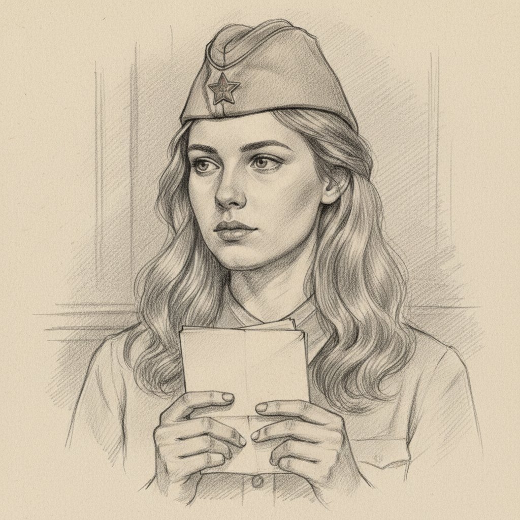 «Используй загруженное фото, сохрани внешность полностью. Молодая женщина в стиле карандашного портрета, мягкая графитовая штриховка, взгляд в сторону, длинные волнистые волосы, пилотка с красной звездой, держит письмо у груди, атмосфера 1940-х годов, реалистичный академический рисунок, тонкие тени, винтажная эстетика, портрет крупным планом, художественный скетч на бумаге».