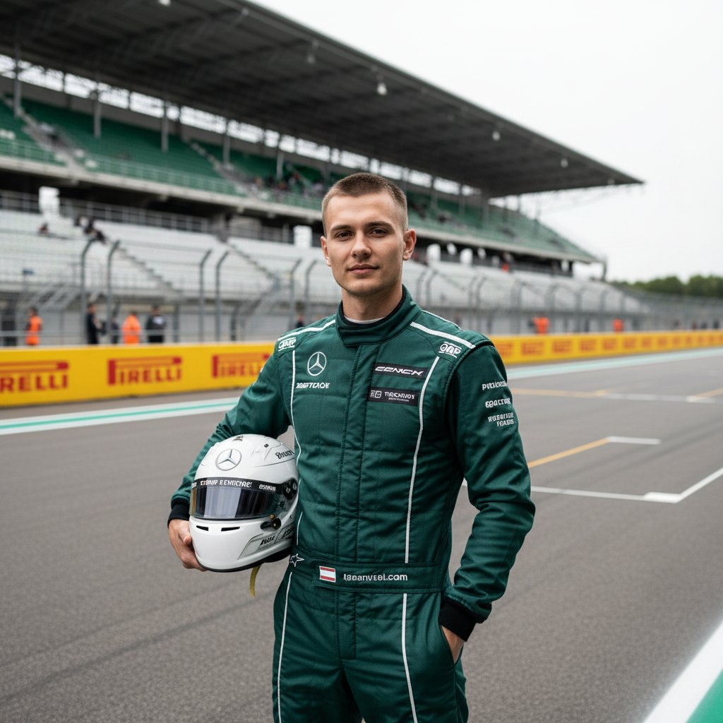 Мужчина в стильном темно-зеленом гоночном костюме с тонкими белыми акцентами, стоит на гоночной трассе Формулы 1 возле трибуны. Руки в карманах, шлем на запястье, взгляд уверенный, направлен в объектив. Фон — гладкий асфальт.