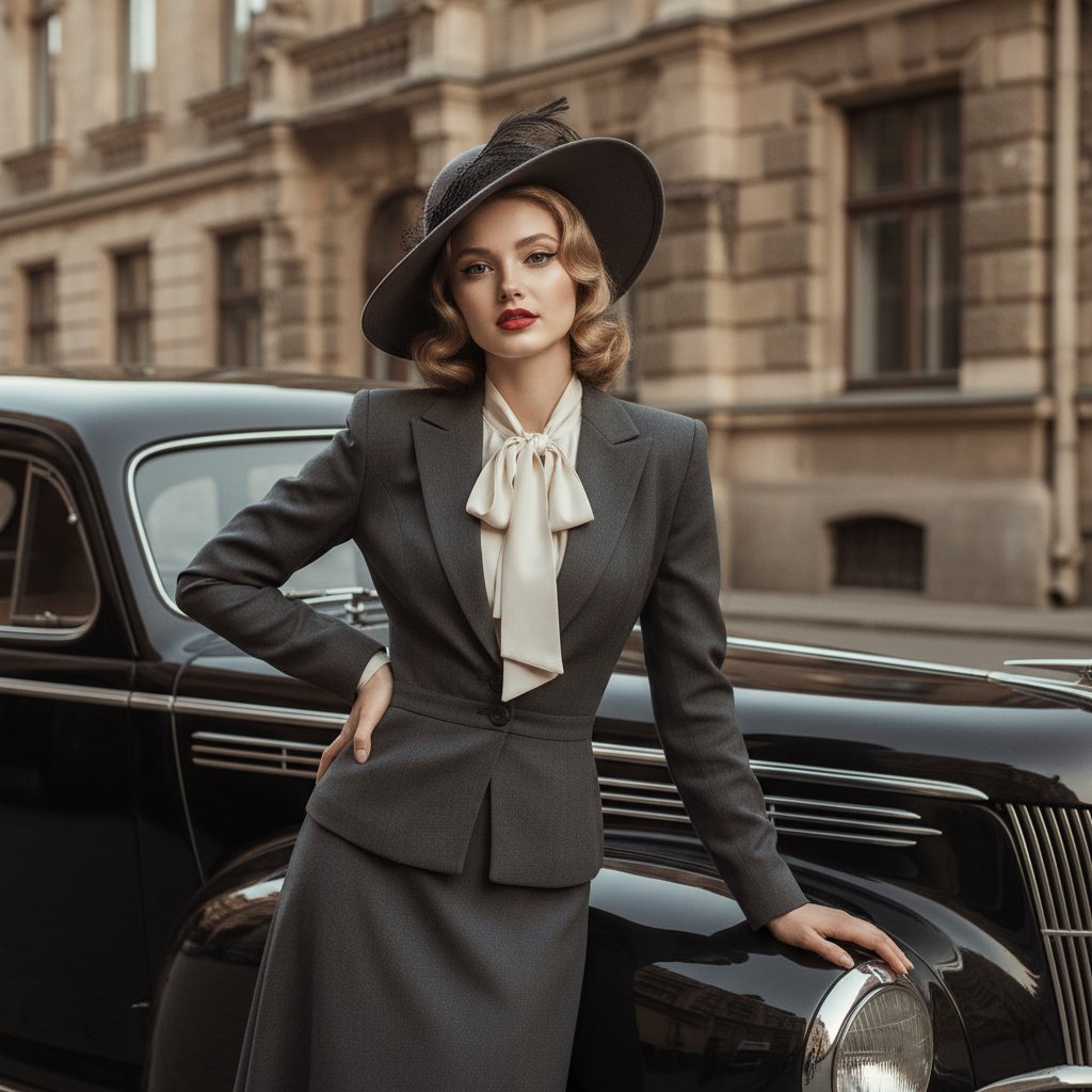 Фотография в стиле 40-х годов: элегантная женщина в костюме с юбкой и блузкой, подчеркивающем моду того времени, с прической волнами и эффектной шляпой. Она опирается на классический автомобиль, одна рука на бедре, демонстрируя уверенность. Макияж в стиле 40-х с выразительными красными губами и подводкой глаз. Мягкое, теплое освещение, имитирующее солнечный день. На заднем плане — старинная архитектура, добавляющая атмосферности.