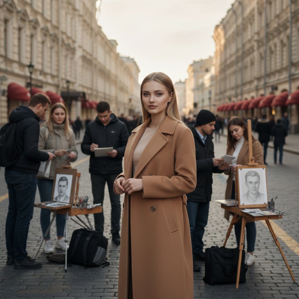 Элегантная женщина в пальто позирует на оживленной улице Арбата, где художники создают портреты. На заднем плане виднеются старинные московские здания. Взгляд направлен прямо в объектив.