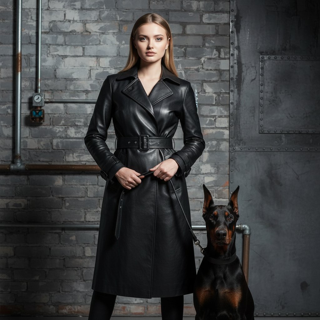 Женщина в элегантном черном кожаном пальто с поясом, стоит рядом с доберманом на поводке. Пес сидит, а женщина смотрит прямо в объектив, держа поводок в руках. Задний план — стена в индустриальном стиле с металлическими элементами. Контрастное освещение подчеркивает ее уверенность и грацию.