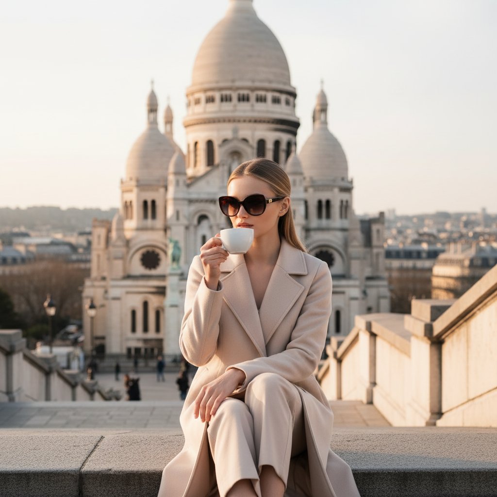 Фотография: женщина в светлом длинном пальто и темных очках сидит на ступенях базилики Сакре-Кёр. В одной руке она держит чашку кофе, другая лежит на колене. За ее спиной виден белоснежный купол, возвышающийся над Парижем. Снимок крупным планом, подчеркивающий атмосферу спокойствия и величие архитектуры.