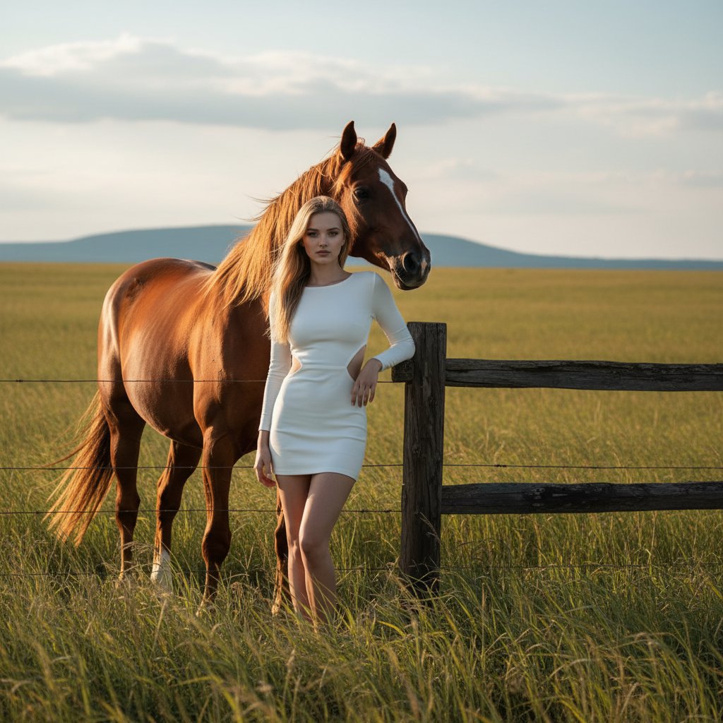 Женский портрет: девушка в обтягивающем мини-платье с разрезами по бокам расположилась у ограды рядом с грациозной лошадью. Место действия – бескрайнее поле, поросшее высокой, слегка развевающейся на ветру травой, с отдаленным силуэтом холма на горизонте.