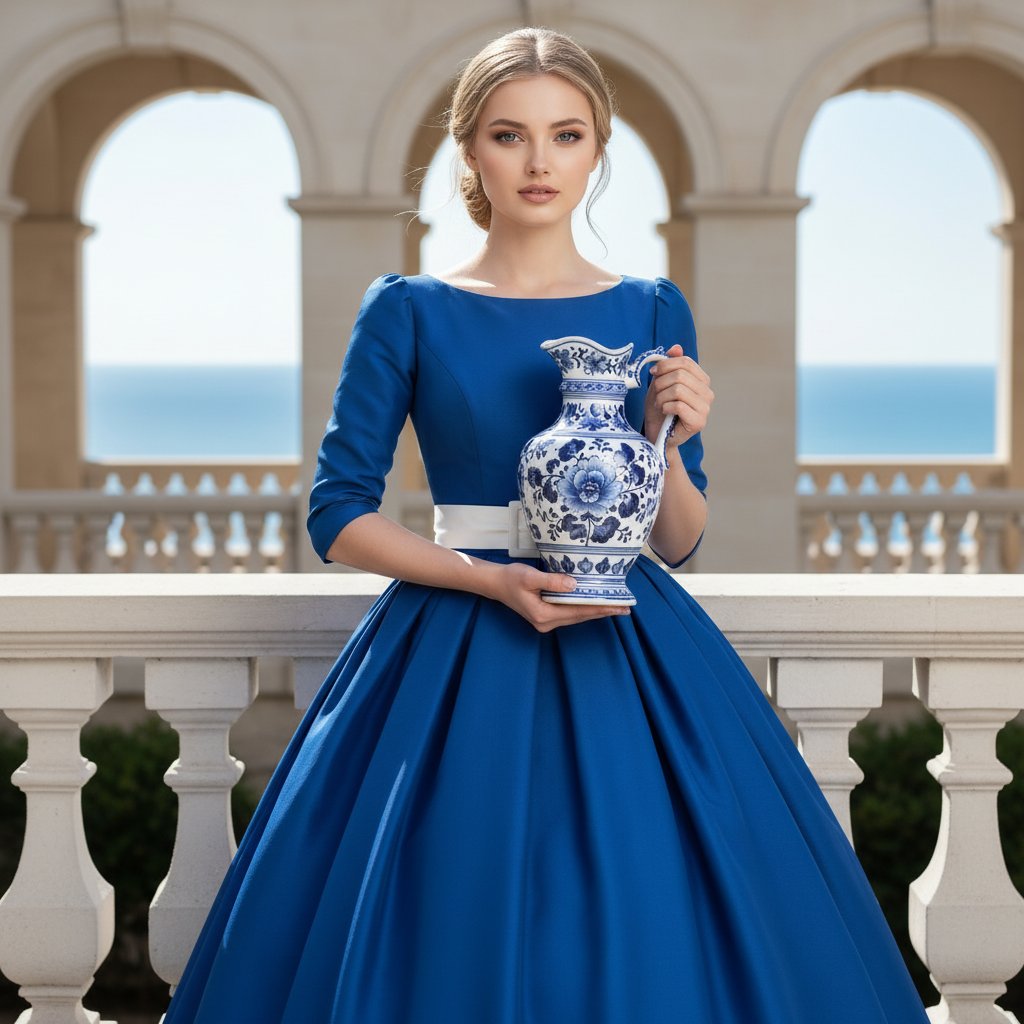 Женщина в пышном голубом платье с белым поясом, снятая по пояс, стоит у белых перил. В руках она держит расписной фарфоровый кувшин, украшенный белыми и голубыми цветами. Взгляд направлен в камеру. Волосы аккуратно уложены в гладкий пучок. Поза естественная, расслабленная. На заднем плане видны арки и морской пейзаж.