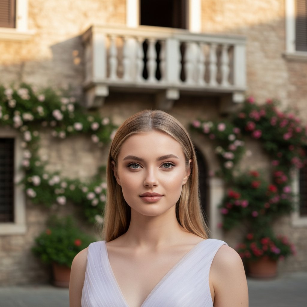 Портрет женщины у знаменитого балкона Дома Джульетты в Вероне. На ней изысканное платье нежного оттенка. Взгляд направлен на зрителя, легкая улыбка на губах. Задний план — старинная стена дома, увитая цветами. Мягкий солнечный свет мягко освещает ее лицо. Атмосфера романтичной Италии, с элементами старины и природы, создающими уют и исторический колорит. Съемка крупным планом, детализация.