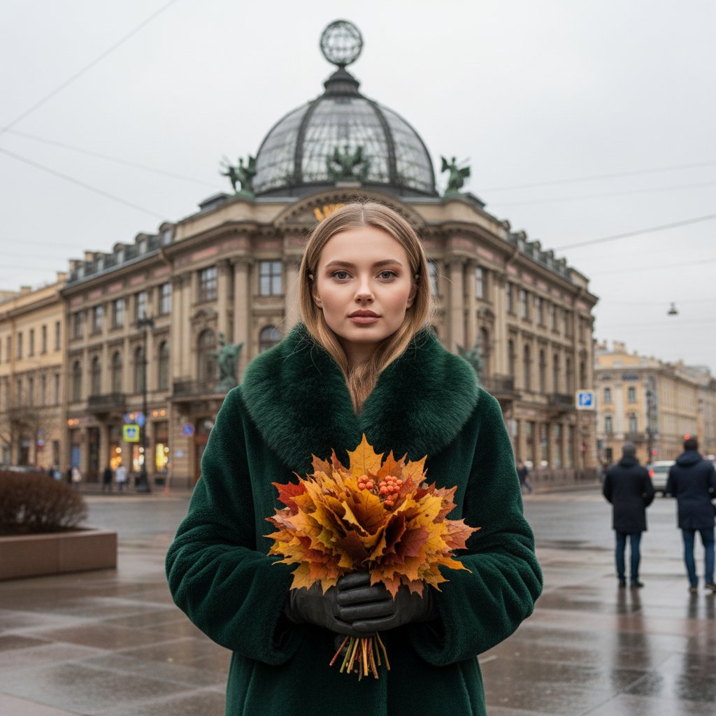 Элегантная женщина в тёмно-зелёном пальто с меховым воротником позирует на Невском проспекте. Перед ней — книжный магазин 'Дом Зингера'. В руках она держит букет из осенних листьев, её взгляд устремлён в объектив. За её спиной видны стеклянный купол и декоративные металлические детали здания. Мягкое освещение подчёркивает её утончённость.