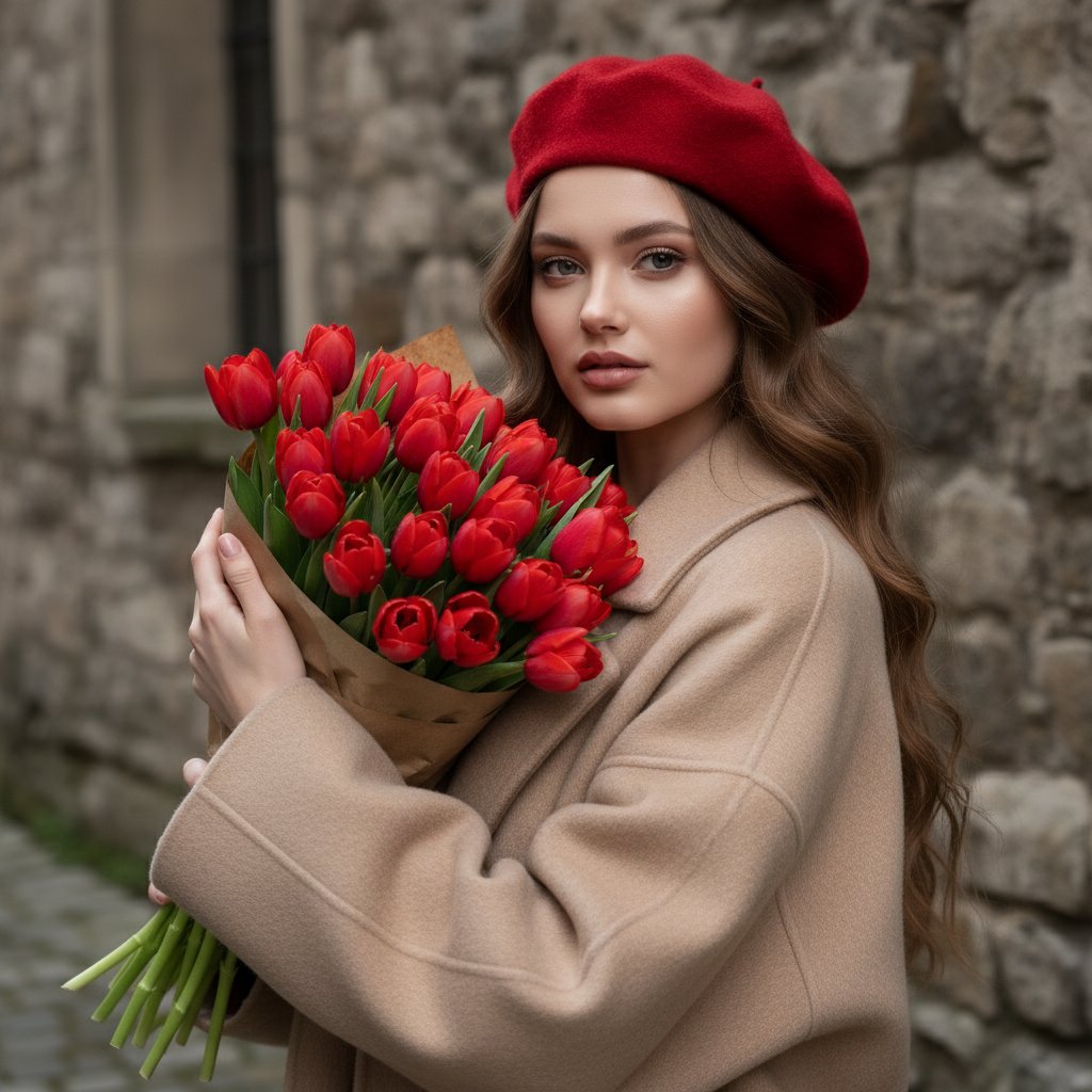 Портрет женщины с длинными каштановыми волосами, одетой в песочное кашемировое пальто оверсайз. Она держит у лица пышный букет алых тюльпанов, на голове красный берет. Фон - стена старинного здания.