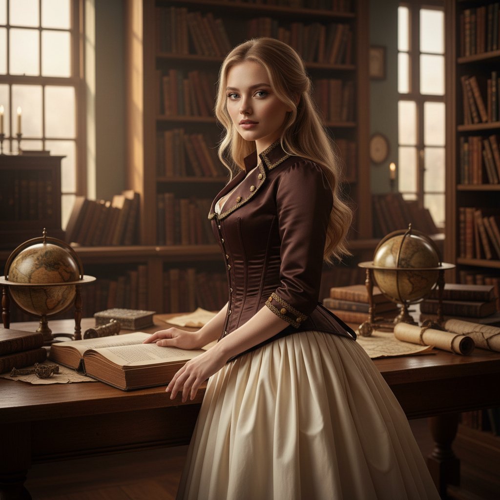 Женский портрет в старинной библиотеке. На ней корсет из сатина цвета темного шоколада, пышная юбка молочного оттенка и короткий жакет с золотой фурнитурой. Героиня полуоборотом стоит у стола с открытой книгой, опираясь на него рукой, и смотрит в объектив. Вокруг видны антикварные глобусы и книжные полки.