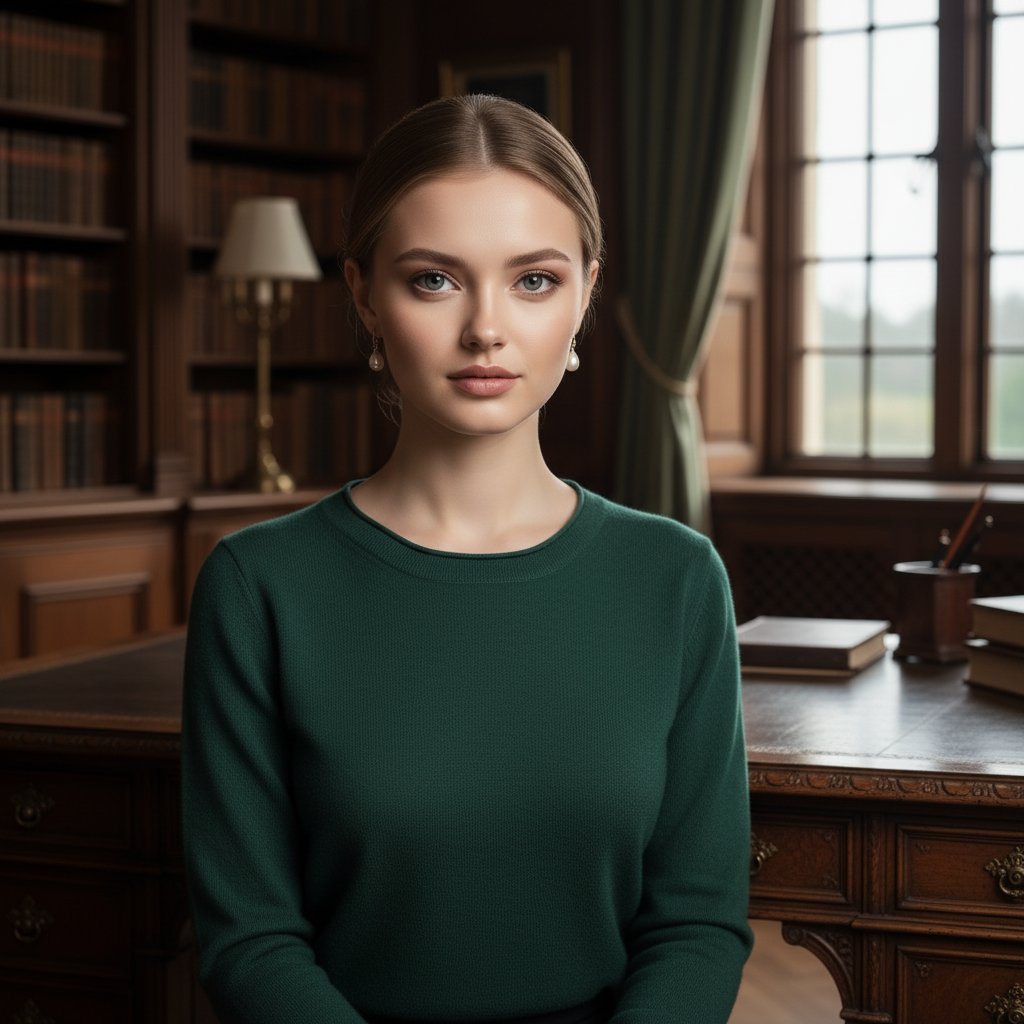 Юная особа с гладкими светло-каштановыми волосами, собранными в аккуратный низкий пучок, расположилась за внушительным письменным столом из темного дерева. Действие происходит в классическом кабинете старинного поместья. На ней надет темно-изумрудный кашемировый джемпер и изящные жемчужные серьги. Взгляд направлен прямо на зрителя, поза излучает уверенность. Кадр фокусируется на верхней части тела, освещение мягкое и рассеянное.