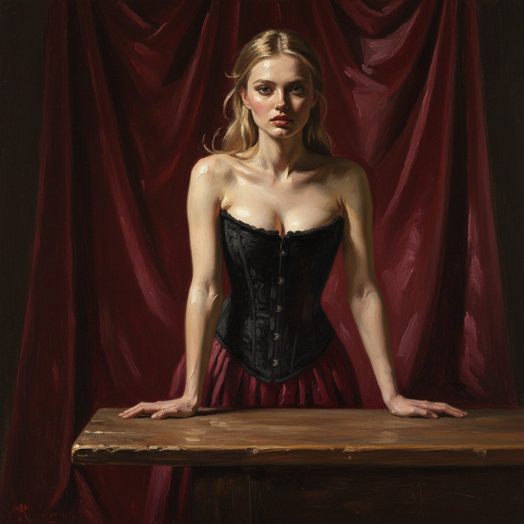 Портрет женщины в черном корсете и длинной юбке, опирающейся руками на край массивного деревянного стола. Мазки масляной краски имитируют свет, играющий на ее плечах и текстуре дерева. На заднем плане — тяжелые бордовые драпировки, добавляющие глубины. Крупный план, выполненный в духе живописи Рембрандта.