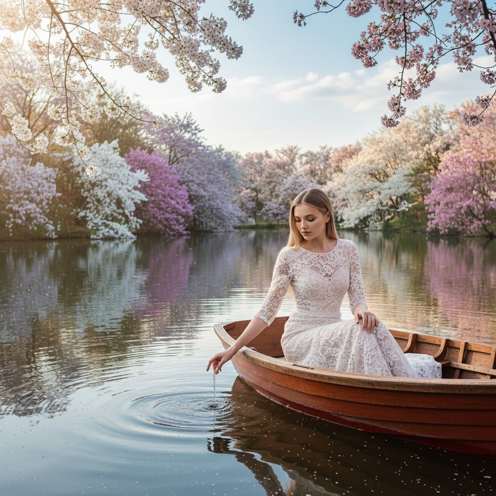 Женщина в изящном белом платье из кружева расположилась в лодке, скользящей по озерной глади. Вокруг берега усыпаны цветущими деревьями. Её взгляд устремлён вниз, кончики пальцев едва касаются воды. В зеркальной поверхности озера отражаются деревья. Мягкий свет подчёркивает её нежный, романтичный образ.
