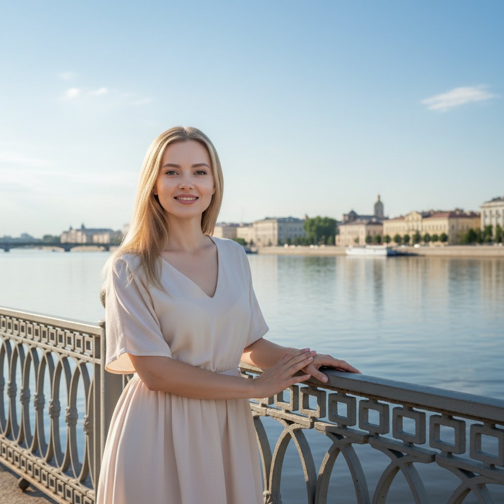 Дама средних лет в легком светлом платье, опираясь обеими руками на изящные перила набережной, смотрит в объектив с теплой улыбкой. На заднем плане — просторная река, отражающая ясное небо, видны городские строения. Мягкое дневное освещение, кадр по пояс.