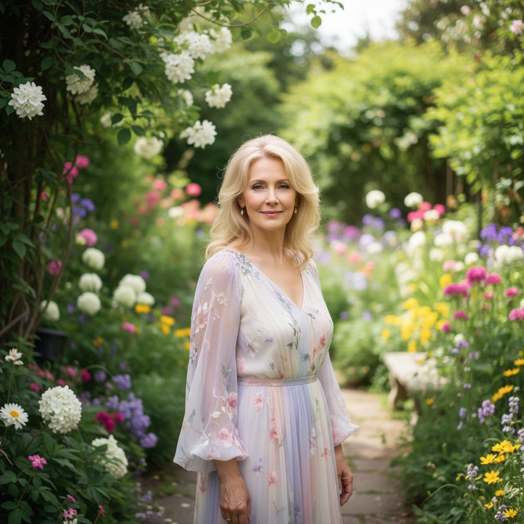 Женщина средних лет (около 55), со светлыми волосами, одетая в элегантное платье нежных пастельных оттенков. Она находится в окружении пышного цветущего сада. Освещение мягкое, дневное. Взгляд направлен прямо на зрителя, на лице легкая, умиротворенная улыбка. Фон состоит из густой зеленой листвы.