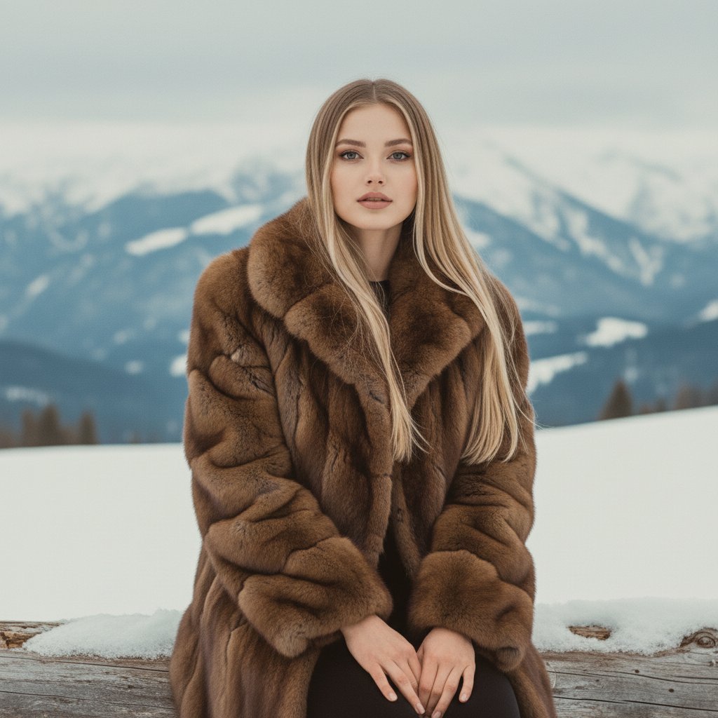Женский портрет на фоне заснеженных горных вершин. Героиня одета в дорогую соболиную шубу орехового цвета с объемным воротником. Она расположилась на бревне, покрытом снегом, ее взгляд направлен в объектив. Волосы свободно ниспадают, макияж выполнен в натуральных тонах. Стиль напоминает винтажную фотосессию, подчеркивающую красоту натурального меха и эстетику ретро.