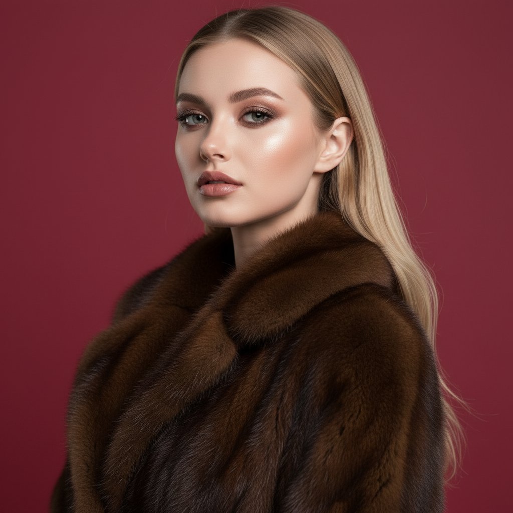 Элегантная женщина в студии, позирует на насыщенном красном фоне. Одета в роскошную соболиную шубу классического кроя, мех насыщенного шоколадного цвета, с объемным воротником. Поза в три четверти, взгляд уверенный, направленный в объектив. Макияж гламурный, волосы распущены. Образ в стиле винтажного журнала, подчеркивающий утонченность.