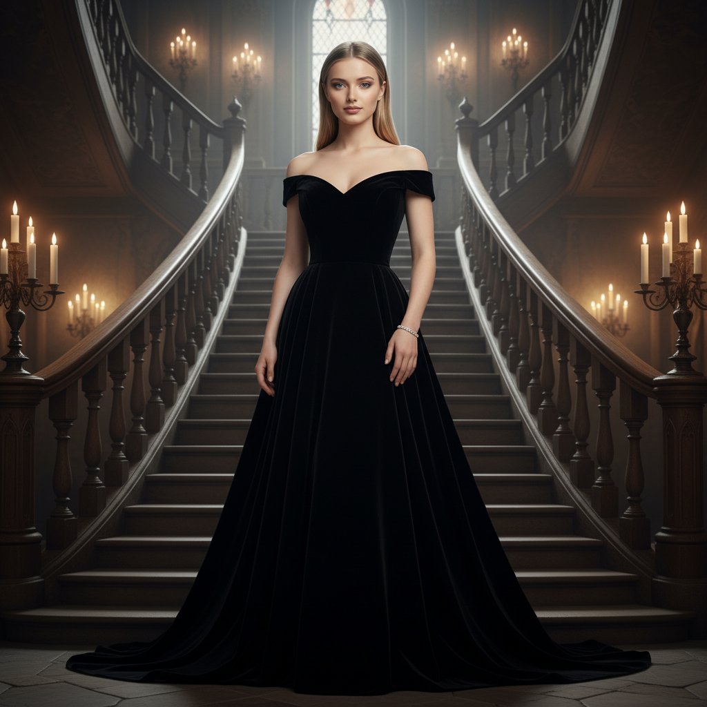 Элегантная женщина в струящемся черном бархатном платье с открытыми плечами и серебряным браслетом стоит у величественной лестницы старинного замка. Ее взгляд направлен прямо в объектив, на губах играет едва заметная улыбка, а одна рука легко касается резных перил. В глубине кадра мерцает мягкий свет свечей, создавая таинственную атмосферу. Освещение деликатное, подчеркивающее черты лица и изысканность образа.