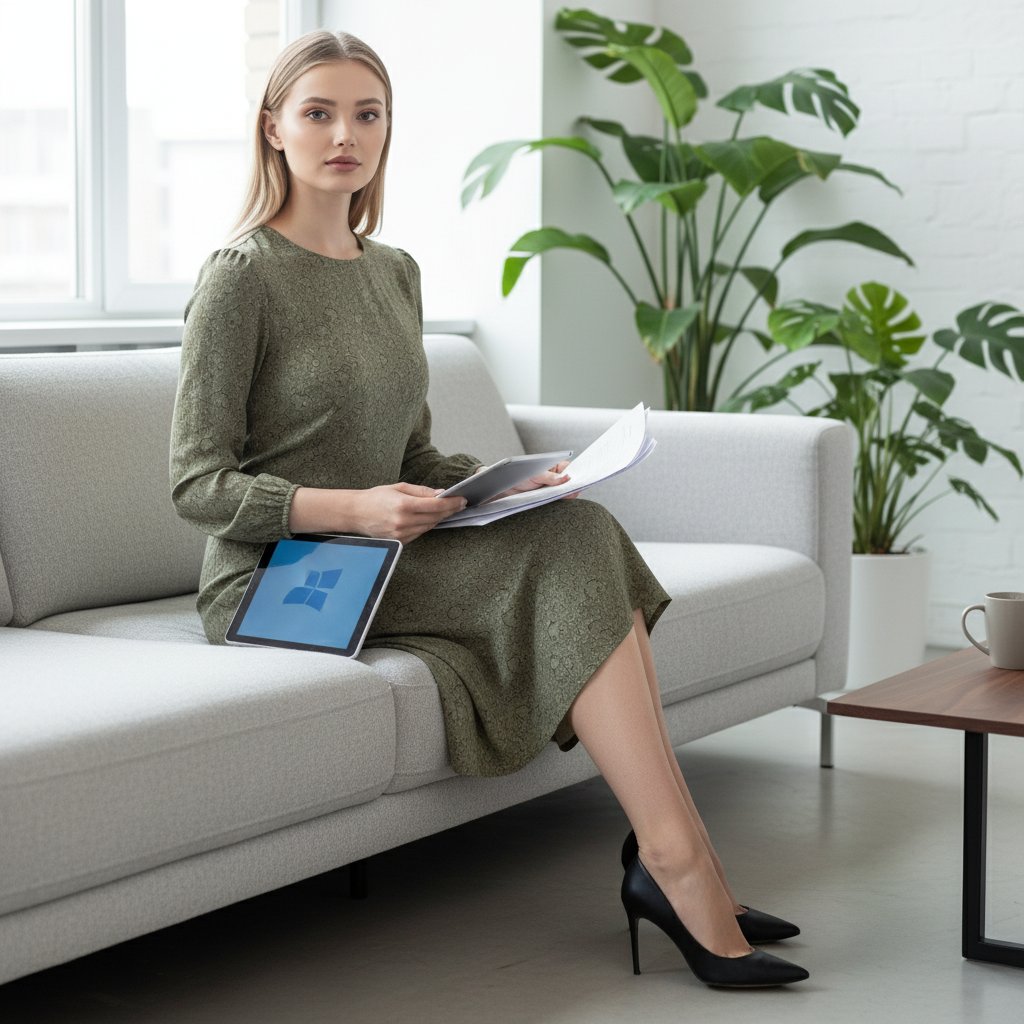 Женщина в стильном платье миди и туфлях на каблуках удобно расположилась на диване в современном офисе. В руках у нее планшет и документы, взгляд уверенно устремлен в объектив. На заднем плане — минималистичный интерьер с зелеными растениями. Снято крупным планом.