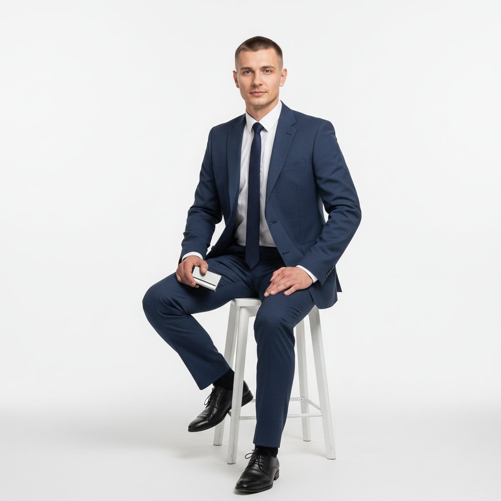 Мужчина средних лет в темно-синем деловом костюме сидит вполоборота на белом минималистичном высоком табурете на циклораме. Спина прямая, ноги согнуты в коленях, руки покоятся на коленях, в одной руке держит визитницу. Взгляд уверенный, направлен прямо в объектив, фон пуст.