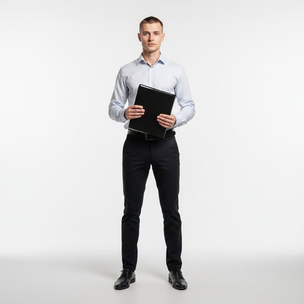 Молодой мужчина в светлой рубашке и темных брюках, стоящий на белой циклораме, смотрит прямо в объектив. В руках у него строгая папка для документов. Поза уверенная, фон минималистичный, подчеркивающий простоту и деловой настрой.