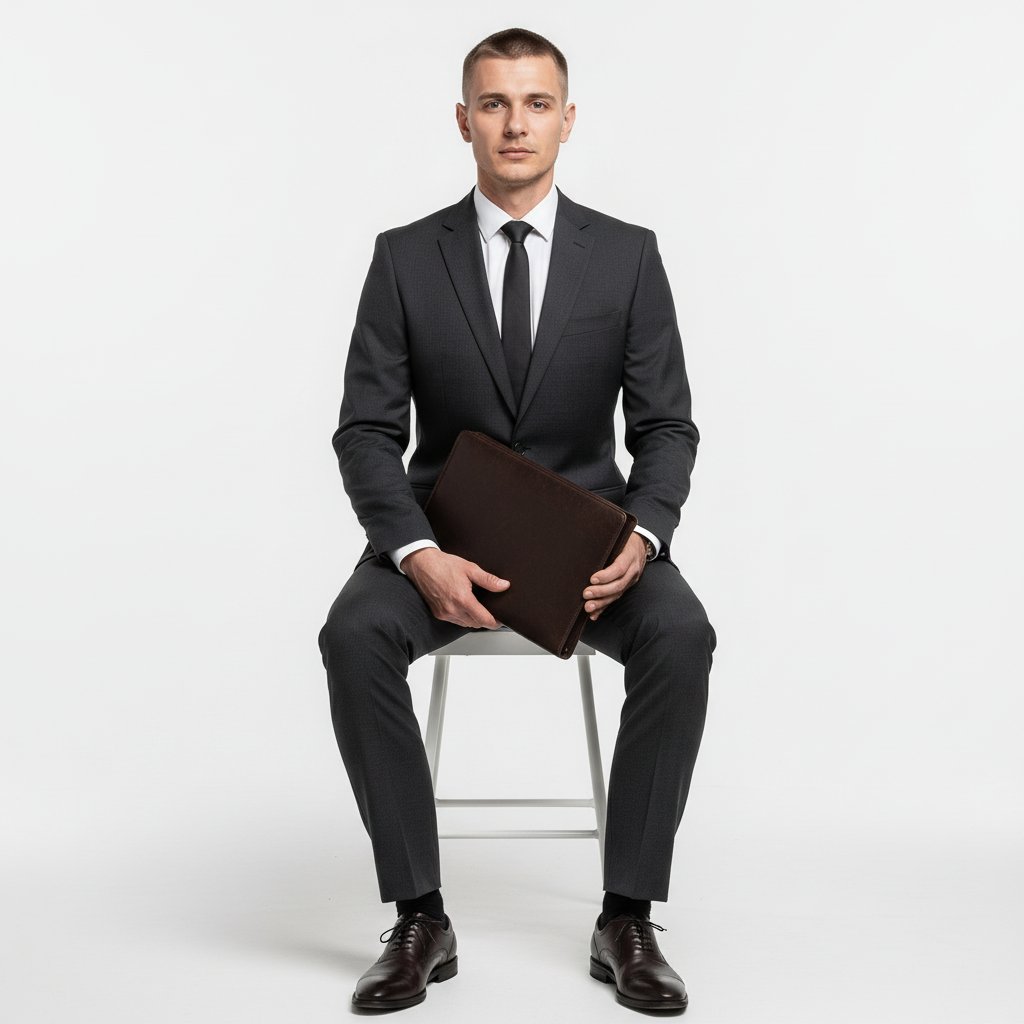 Мужчина средних лет в строгом темно-сером костюме сидит на белом стуле в студии с циклорамой. В руках он держит закрытую кожаную папку. Взгляд направлен в объектив, поза уверенная и собранная. Фон абсолютно чистый, подчеркивающий деловую и минималистичную атмосферу.