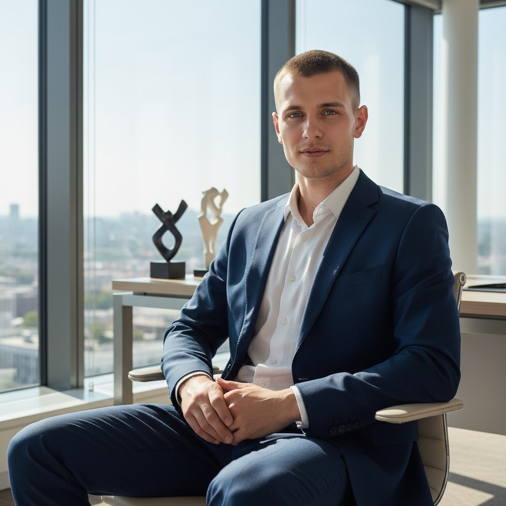 Мужчина в элегантном синем костюме и белой рубашке, без галстука и украшений, расположился в современном офисе у панорамного окна. Он сидит, положив руки на колено, корпус немного повернут, взгляд направлен прямо в объектив. Снято со среднего плана.