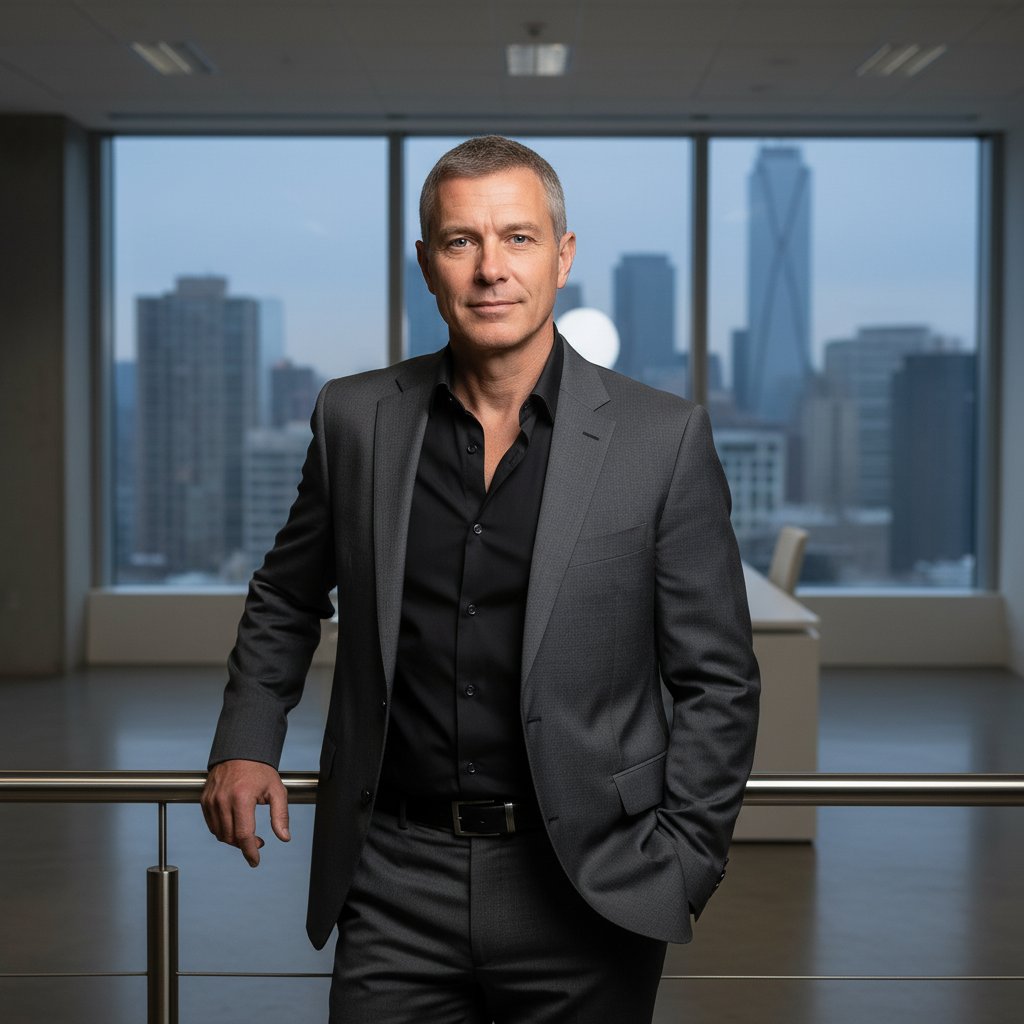 Мужчина средних лет в элегантном графитовом костюме и черной рубашке стоит у панорамного окна в современном офисе, одна рука на перилах, взгляд прямо в камеру, средний план, минималистичный стиль.