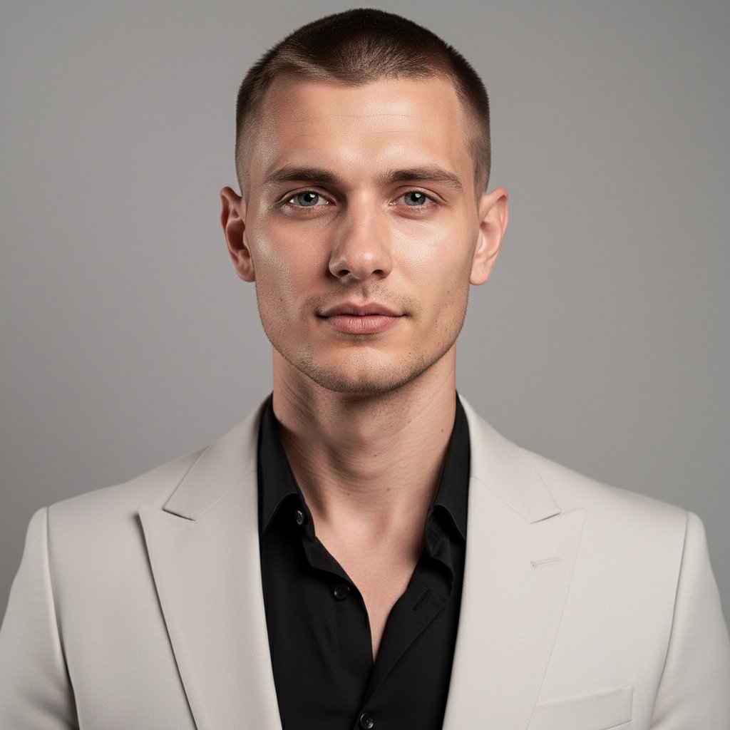 Мужчина в элегантном светлом костюме, без галстука, под пиджаком — гладкая чёрная рубашка. Полное отсутствие аксессуаров. Фон — гладкий, нейтральный. Образ располагает к открытому диалогу. Стоит лицом к зрителю, снят в среднем плане. Современный, лаконичный стиль.