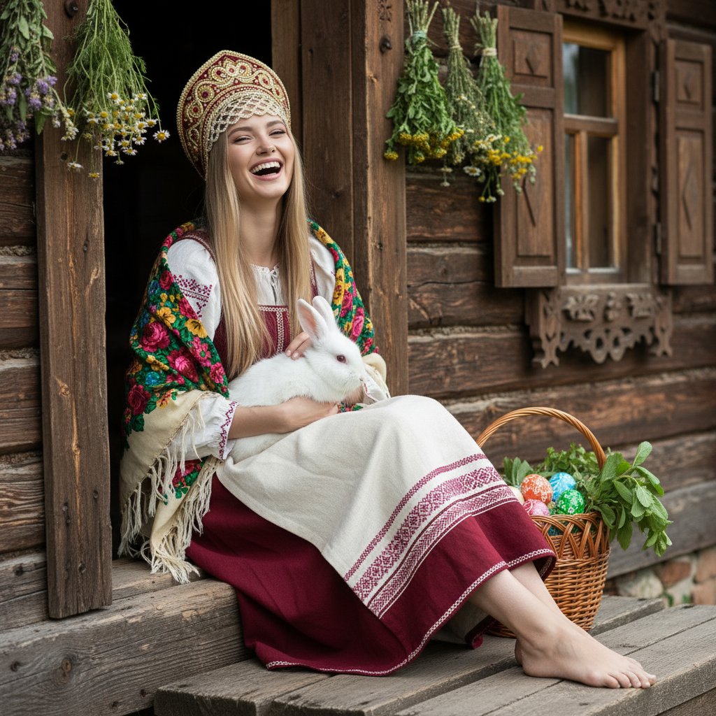 Женщина в старинном русском костюме сидит на пороге избы, босые ноги, рядом корзина с пасхальными яйцами. На руках у неё кролик, она смеётся, глядя в объектив. За её спиной резные ставни и пучки душистых трав. Крупный план, передающий атмосферу уютного деревенского быта.