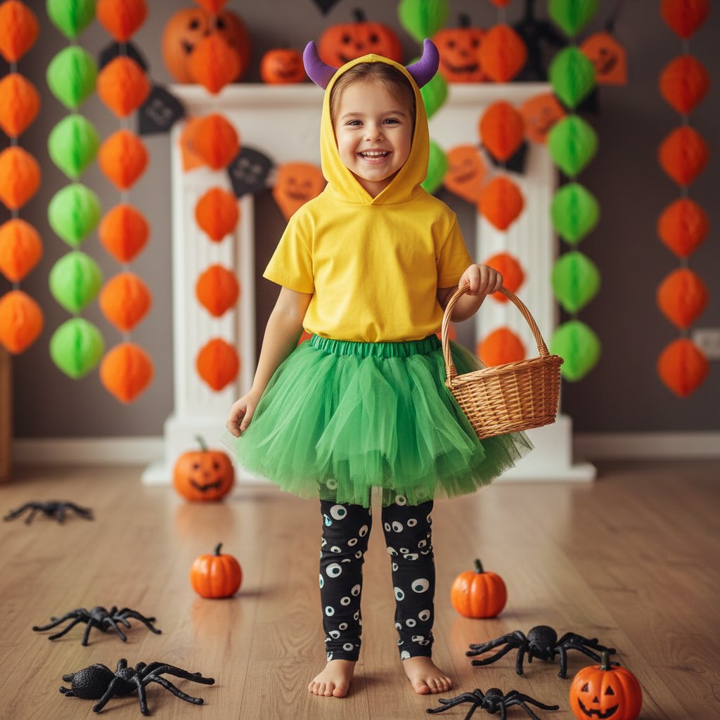 Ребенок в празднично украшенной комнате, декорированной оранжевыми и зелеными гирляндами. На ребенке костюм милого монстра: желтая футболка с фиолетовыми рожками на капюшоне, зеленая юбка из фатина, леггинсы с рисунком глаз. В руках корзинка для конфет. Ребенок улыбается прямо в камеру. Вокруг разбросаны игрушечные пауки и маленькие тыквы.