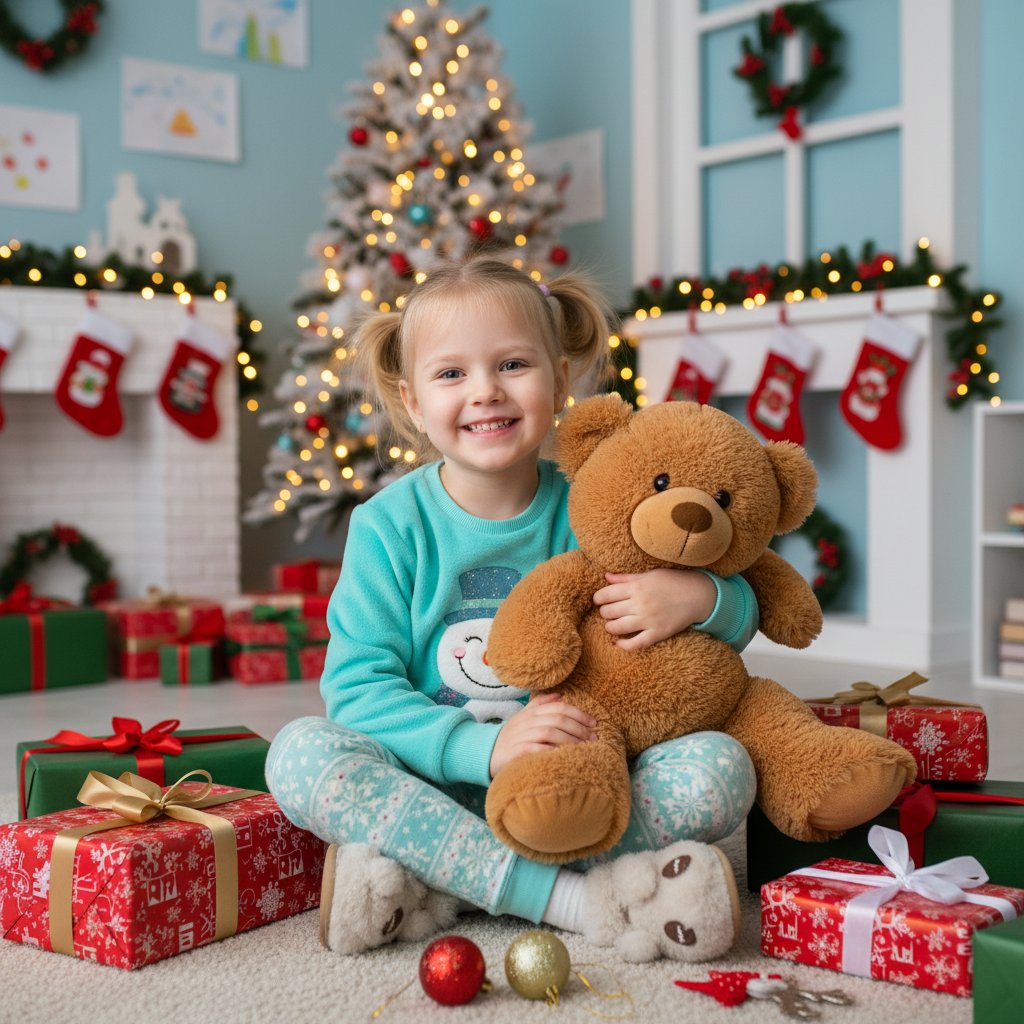 Ребенок в уютной детской комнате, украшенной к Новому году. На девочке бирюзовый свитшот со снеговиком, леггинсы со снежинками и мягкие тапочки. Она сидит на полу, обнимая плюшевого мишку, и смотрит в камеру с улыбкой. Вокруг разложены подарки и новогодние украшения.