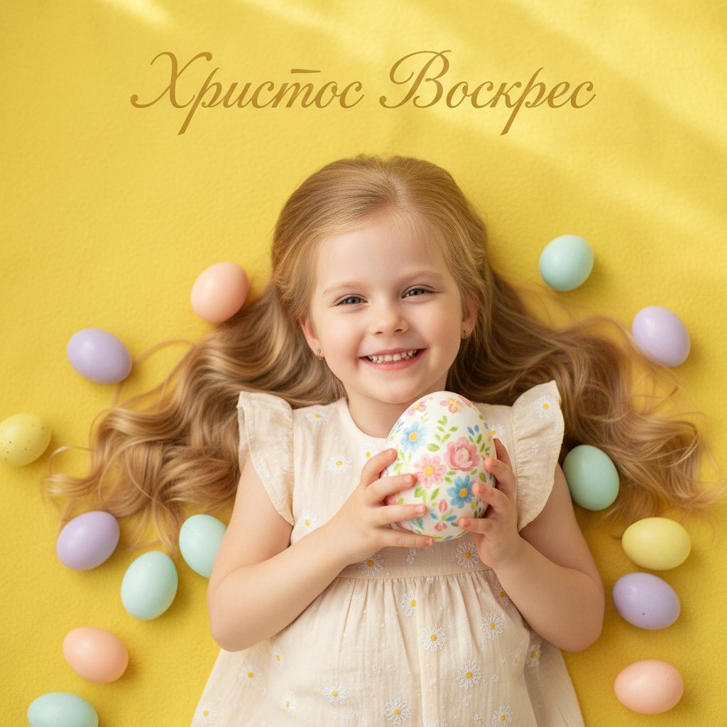 Создай нежный детский пасхальный портрет. Маленькая девочка с длинными светлыми волосами лежит на ярком желтом фоне и держит в руках большое декоративное пасхальное яйцо. Вокруг нее разложены разноцветные яйца в пастельных оттенках. Девочка улыбается, на ней легкое весеннее платье. Атмосфера радостная, солнечная, детская и очень теплая. Мягкий свет, яркие цвета, photorealistic, high detail, studio portrait, 4k. Добавь нежную праздничную надпись: «Христос Воскрес».