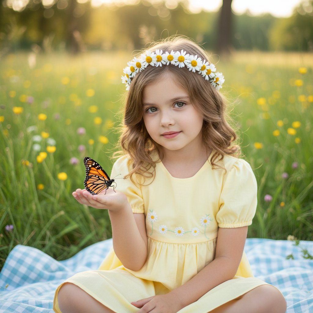 Крупным планом изображена очаровательная девочка в летнем платье, на голове у нее венок из ромашек. Она сидит на покрывале посреди луга, увлеченно рассматривая бабочку, сидящую на ее ладони. Взгляд девочки задумчив и направлен в камеру, передавая нежность и магию момента.
