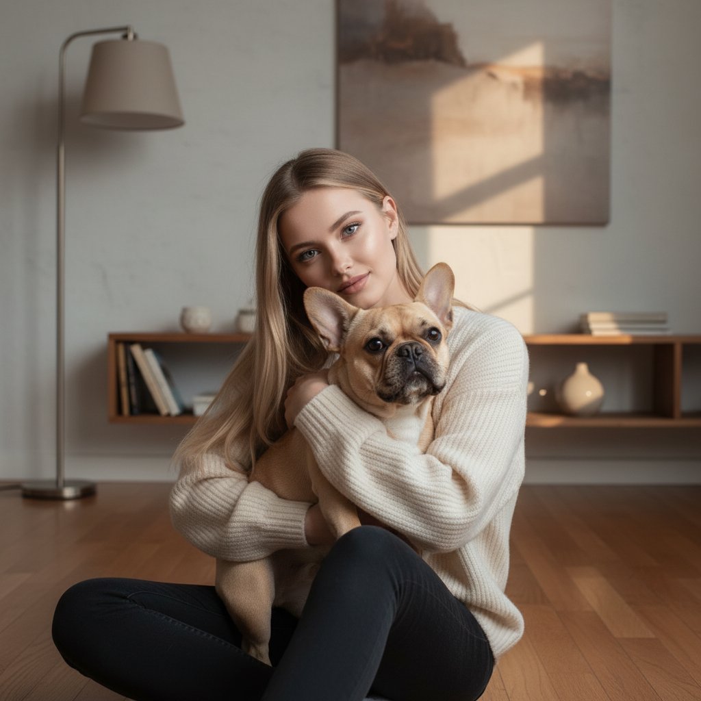 Молодая женщина расслабленно сидит на полу, обнимая своего французского бульдога. Мордочка собаки обращена к зрителю с выражением любопытства. На заднем плане — лаконичный интерьер, освещенный мягким светом от лампы, создающим уютные тени.
