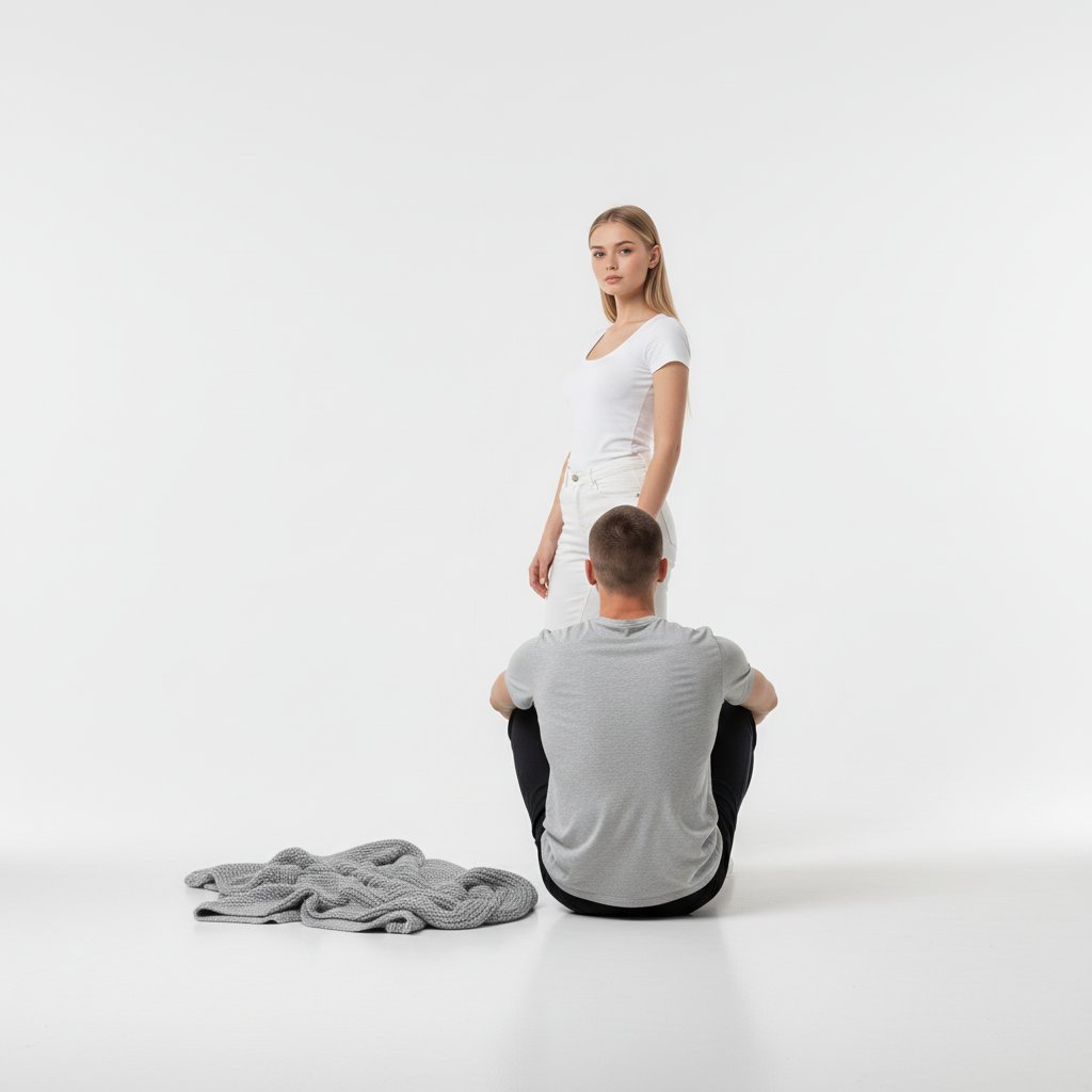 Девушка в белом топе позирует на фоне белой циклорамы, рядом с ней лежит свернутый плед. Молодой человек сидит спиной к зрителю, облокотившись на пол, его лицо не видно. Она уверенно смотрит в объектив, подчеркивая минимализм и женственность.