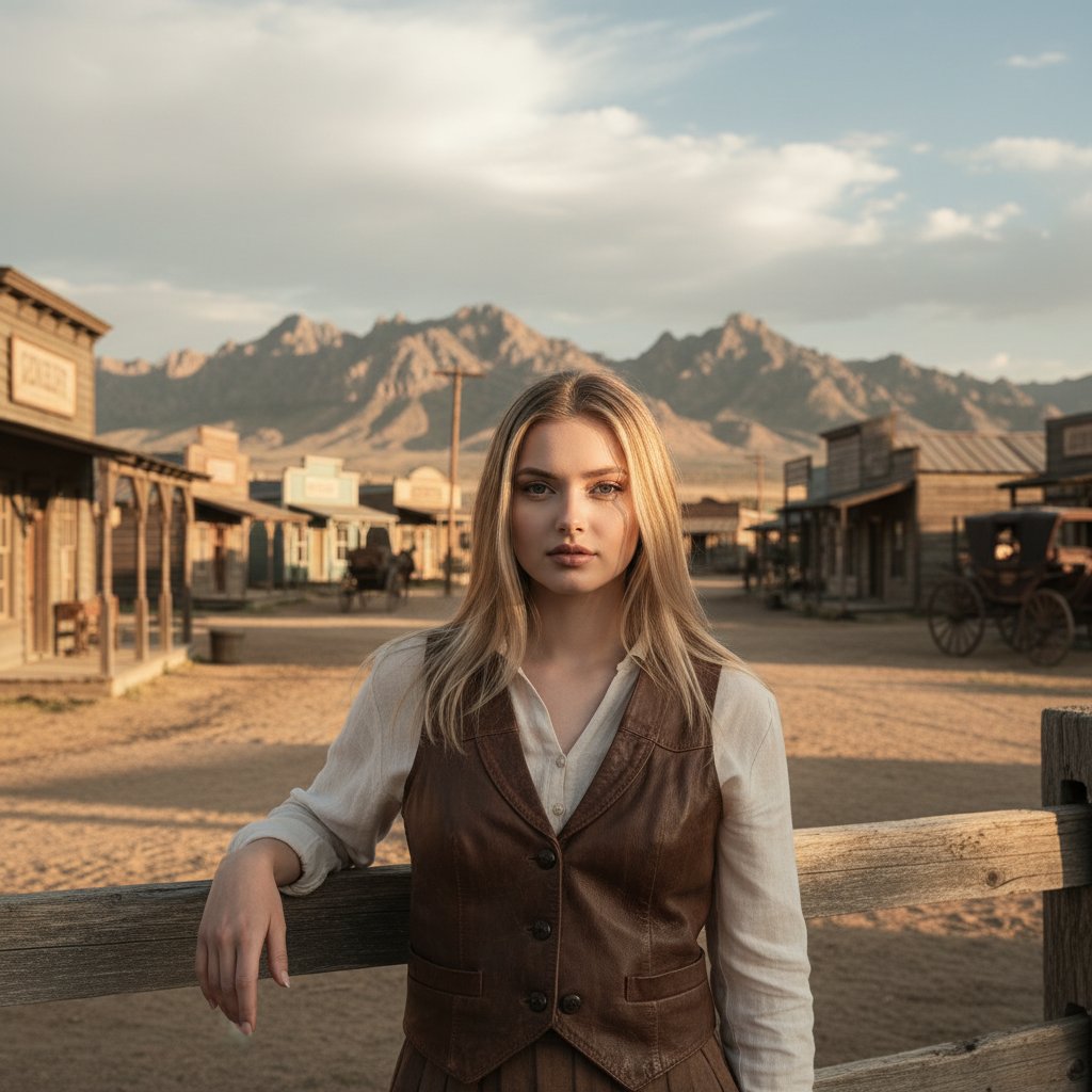 Фотография молодой женщины, стоящей у деревянного забора. За ней раскинулся пейзаж старинного города, выполненный в эстетике вестерна.