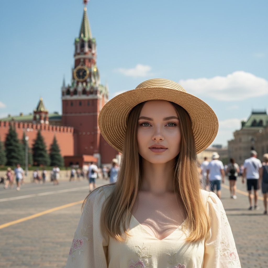 Портрет молодой женщины с темными волосами, одетой в светлое летнее платье и соломенную шляпу. Она стоит на Красной площади, глядя прямо в объектив. На заднем плане видна Спасская башня. Время - летний полдень, освещение мягкое солнечное, небо голубое.