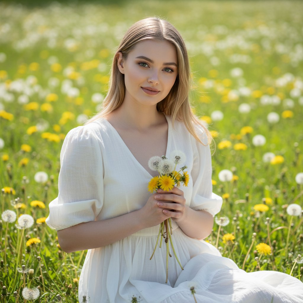Юная девушка расположилась на залитой солнцем лужайке, окруженная пушистыми одуванчиками. На ней воздушное светлое платье. В руках она держит букетик одуванчиков и смотрит в объектив с умиротворенной улыбкой. Зеленая трава вокруг создает атмосферу безмятежного лета и простоты.