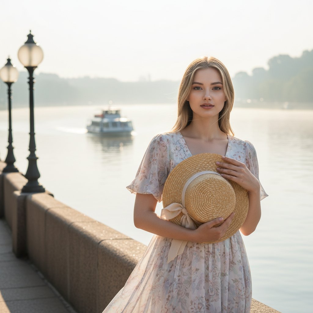 Юная особа в легком летнем наряде позирует у реки, прижимая к себе шляпу и глядя прямо в объектив. За ней — речная гладь, окутанная дымкой, старинные фонари и проплывающий катер. Мягкий утренний свет, средний план.