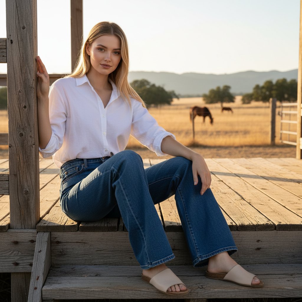 Молодая женщина в джинсах-клеш цвета индиго и простой белой рубашке из хлопка, рукава закатаны. На ногах — лаконичные светлые сандалии. Она сидит на деревянной ступеньке веранды, одна рука лежит на перилах, другая — на колене. Взгляд прямой и уверенный, направлен в объектив. Задний план — пейзаж ранчо.