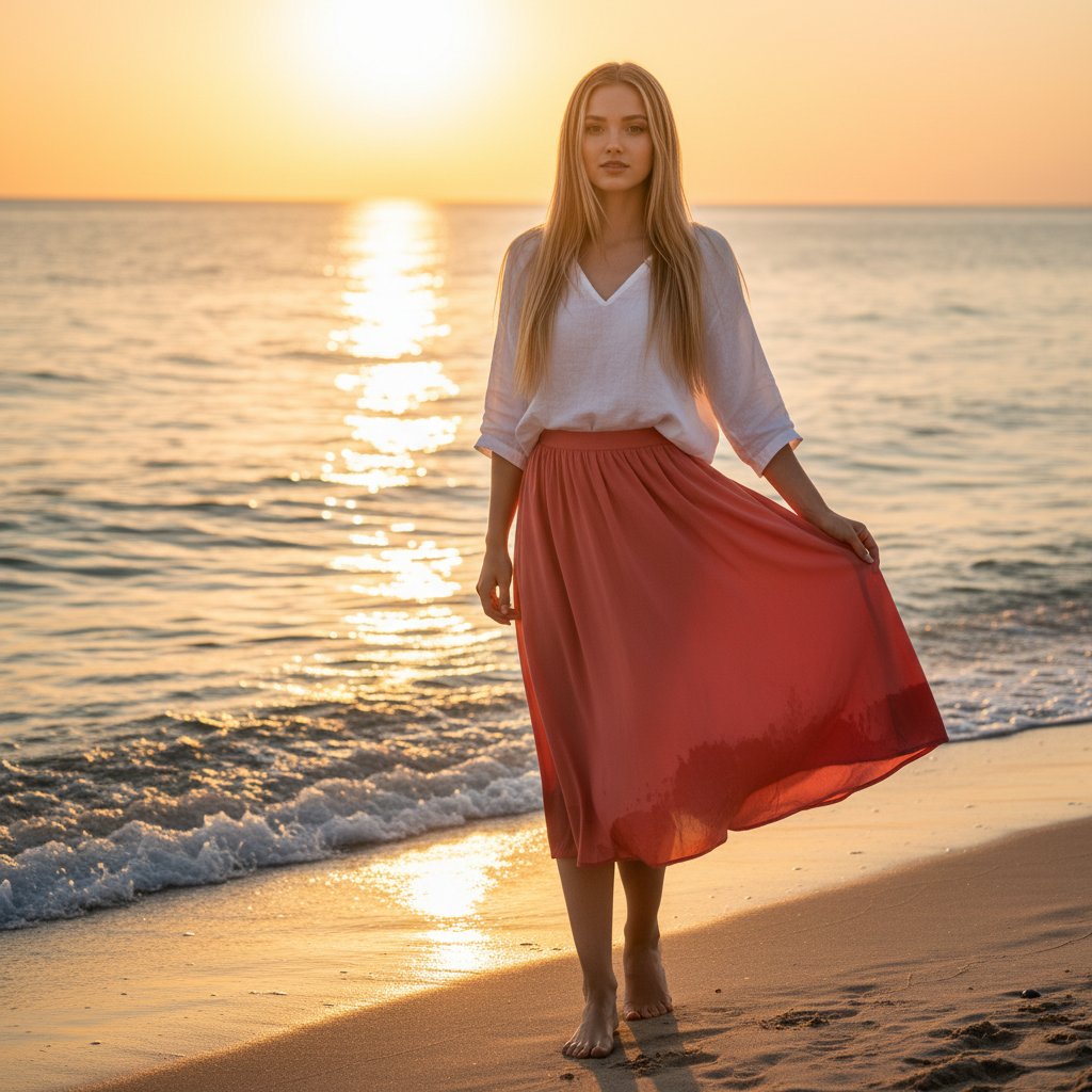 Фотография девушки в развевающейся коралловой юбке и белой блузке. Она стоит босиком на берегу, придерживая край юбки. Заходящее солнце окрашивает небо и воду в теплые тона. Девушка смотрит в объектив, позади нее накатывают волны.